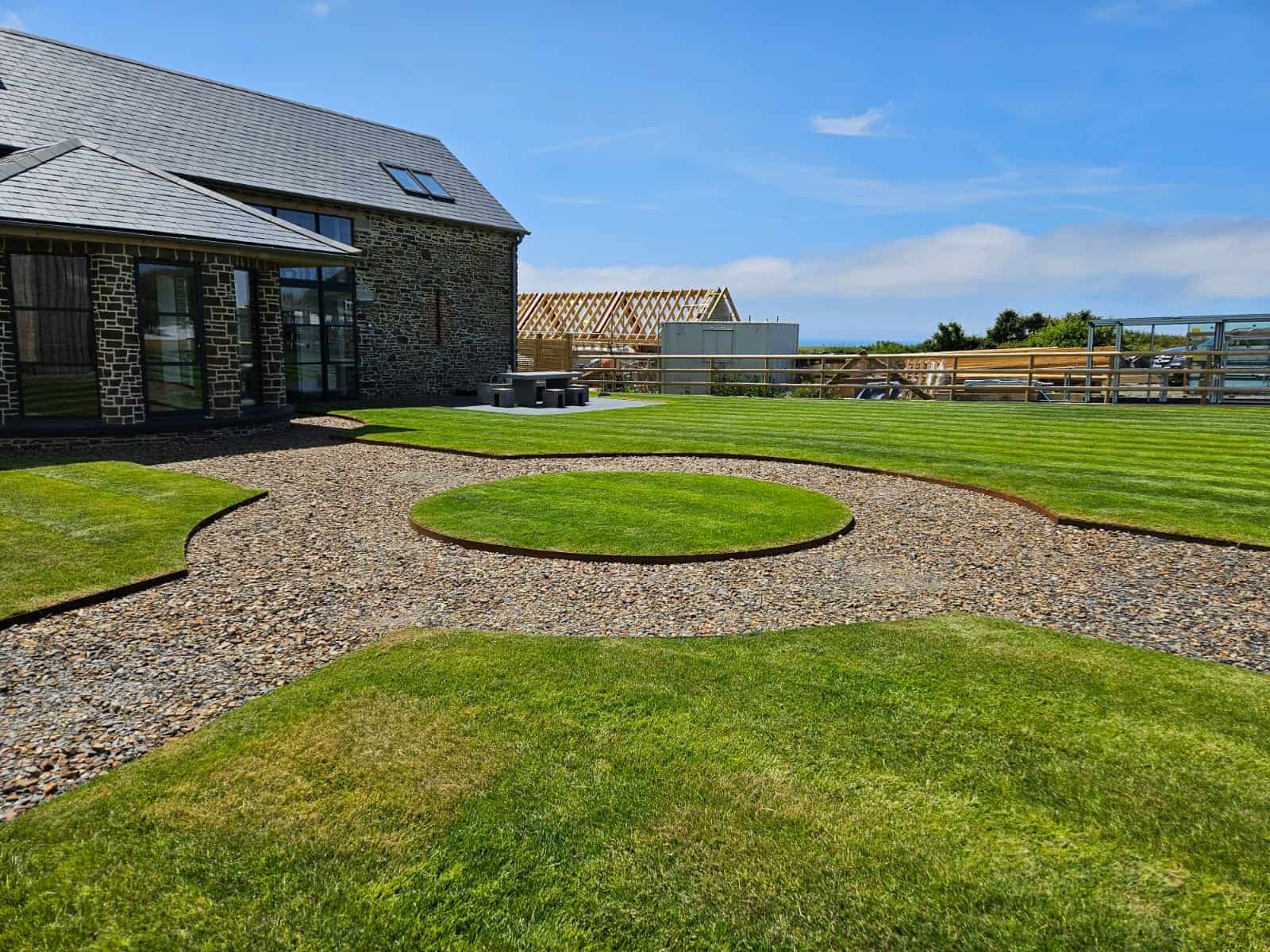 Material selection was central to the design, chosen to reflect the existing architecture, coastal conditions, and surrounding North Devon landscape. Locally sourced stone was used for pathways, complemented with steel edging set slightly below lawn level to provide crisp definition between surfaces without overwhelming the soft planting.