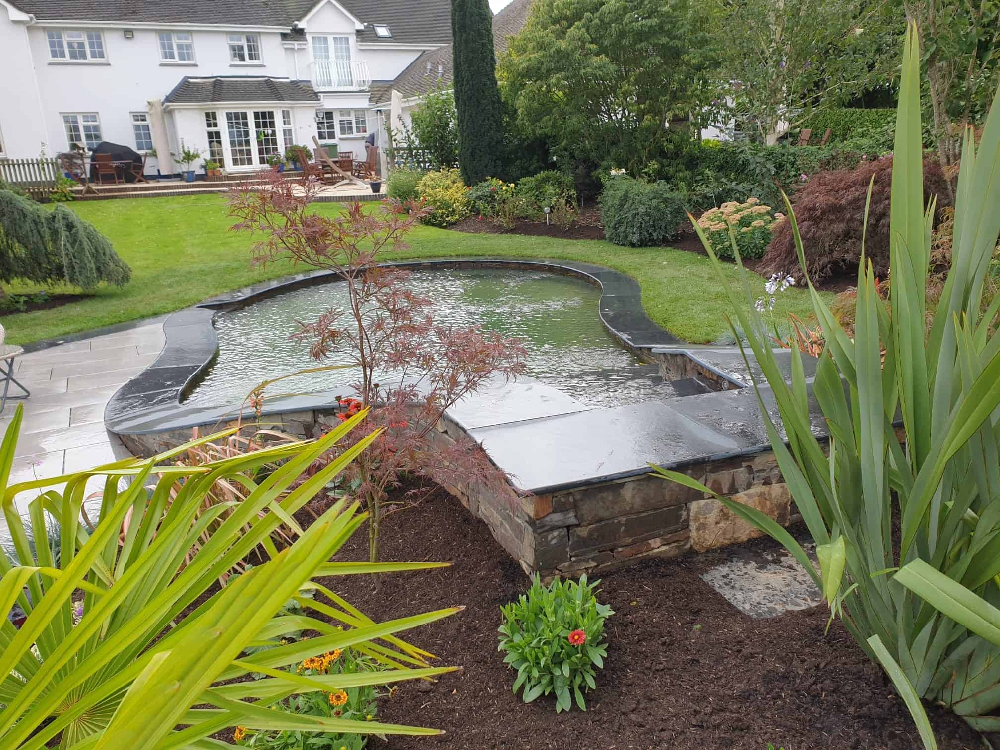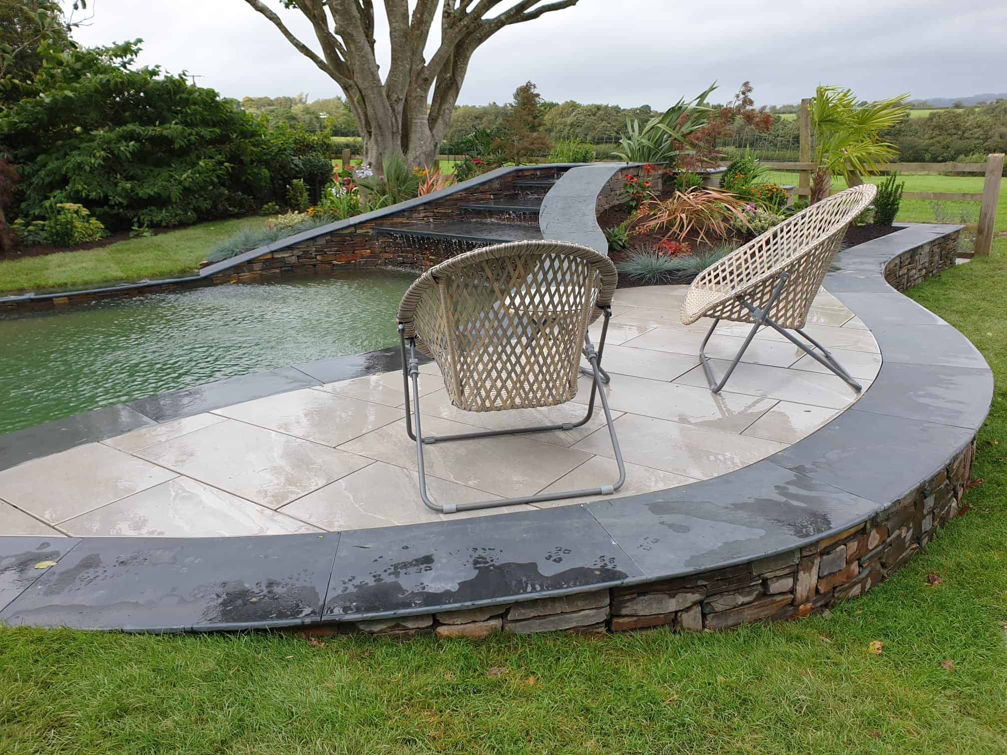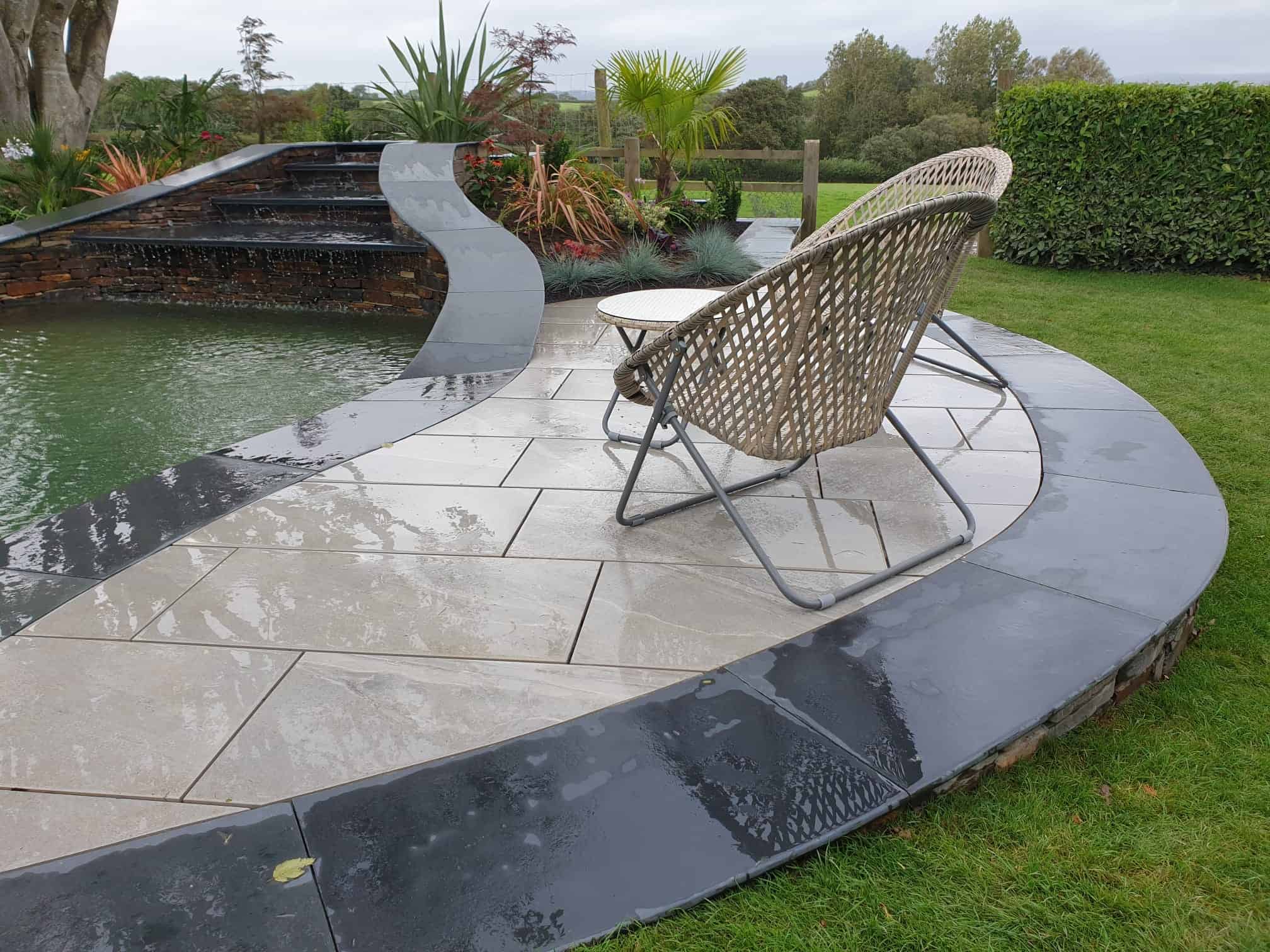 Material selection was central to the design, chosen to reflect the existing architecture, coastal conditions, and surrounding North Devon landscape. Locally sourced stone was used for pathways, complemented with steel edging set slightly below lawn level to provide crisp definition between surfaces without overwhelming the soft planting.