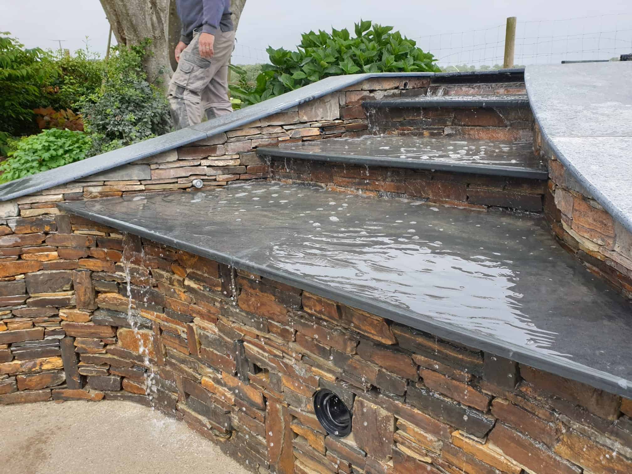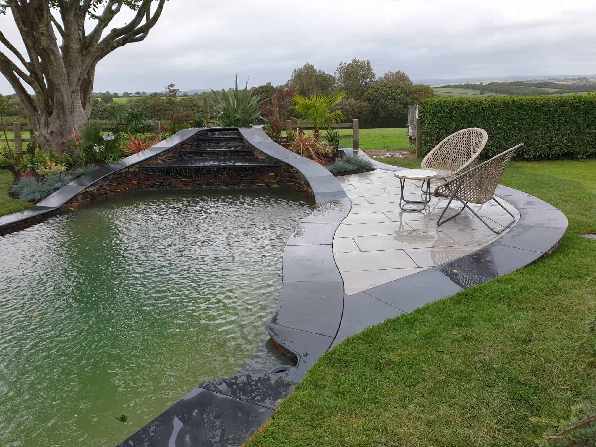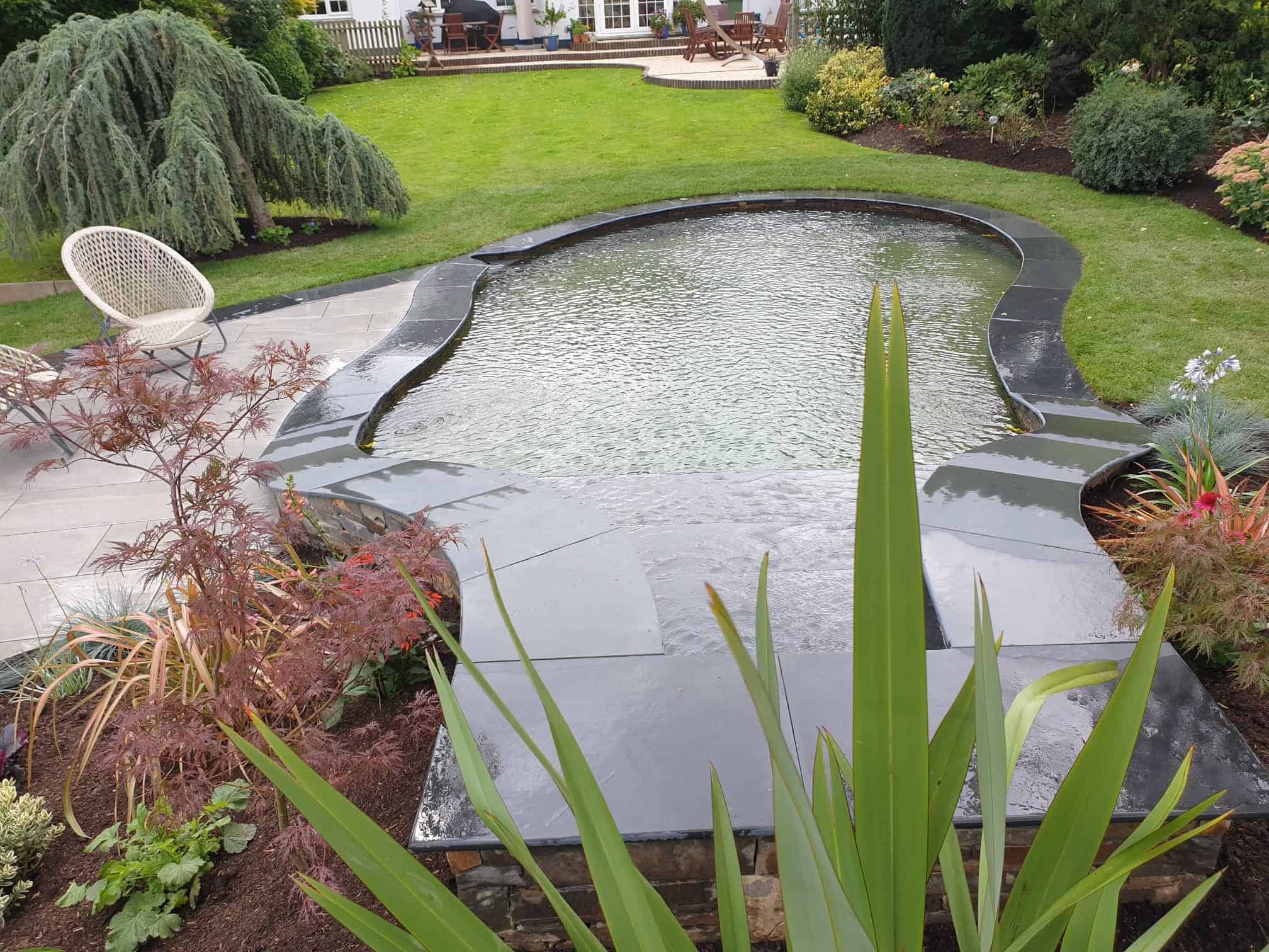 Material selection was central to the design, chosen to reflect the existing architecture, coastal conditions, and surrounding North Devon landscape. Locally sourced stone was used for pathways, complemented with steel edging set slightly below lawn level to provide crisp definition between surfaces without overwhelming the soft planting.