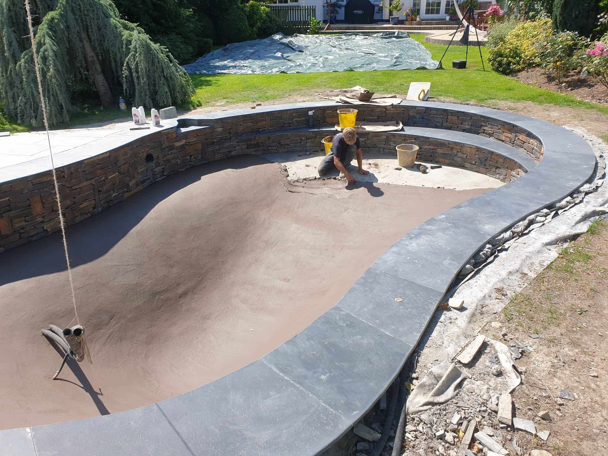 A large composite deck and steps were installed on a concrete base for durability and low maintenance, while a natural slate patio provided a robust and visually appealing seating area. Corten steel detailing around the gym and wellness spaces adds texture and continues to develop character over time.